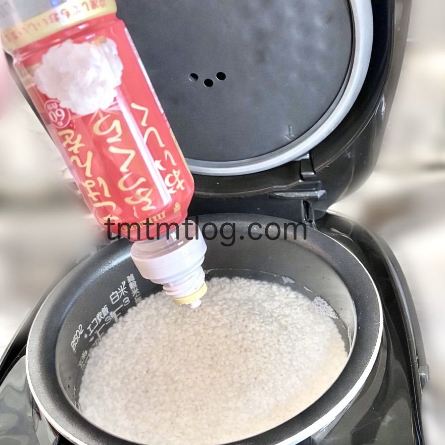 今回は3合炊いたので、「ごはんをふっくらおいしく」を3回まわしかけてよく混ぜてから炊飯しました。